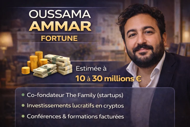Malgré ce tableau judiciaire chargé, la fortune d’Oussama Ammar est estimée à plus de 5 millions d’euros. Ses revenus proviennent principalement de ses participations dans des startups, soit 60 % de son patrimoine total, puis des conférences et du coaching pour 25 %, de l’immobilier pour 10 %, et enfin des liquidités pour les 5 % restants.